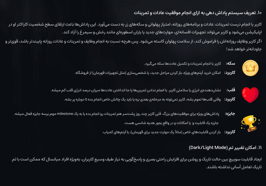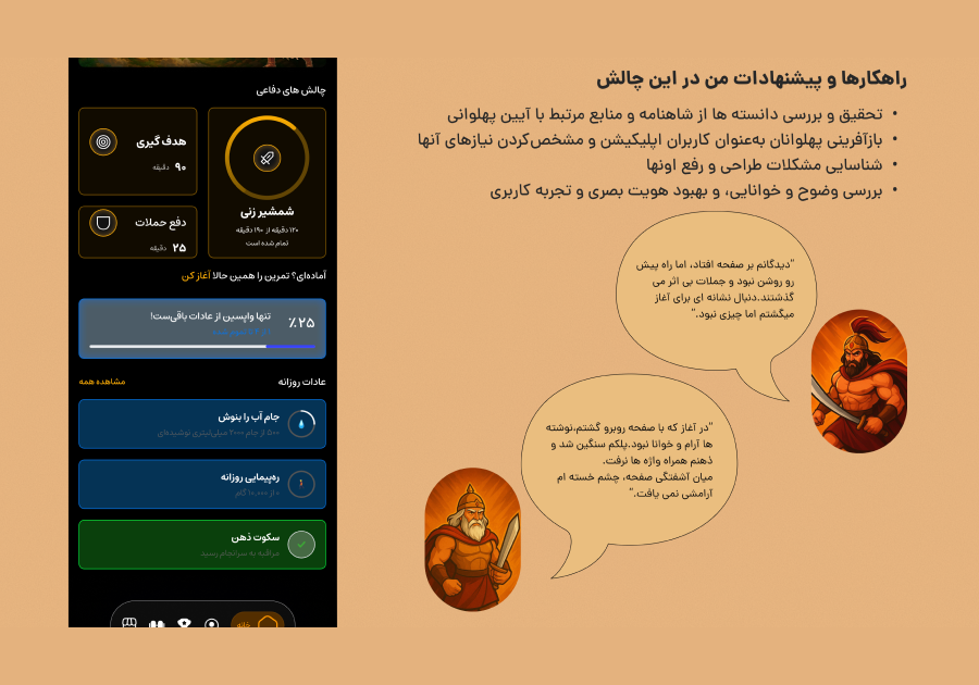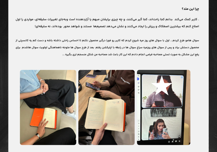 ۲. مستندات و توضیحات طراحیتوی این فایل بنویسید چطور به ایدهتون رسیدید، از چه روشها و ابزارهایی استفاده کردید، و طراحیتون قراره چه مشکلی رو حل کنه. حتما به نیازها و شرایط کاربر هم اشاره کنید.
