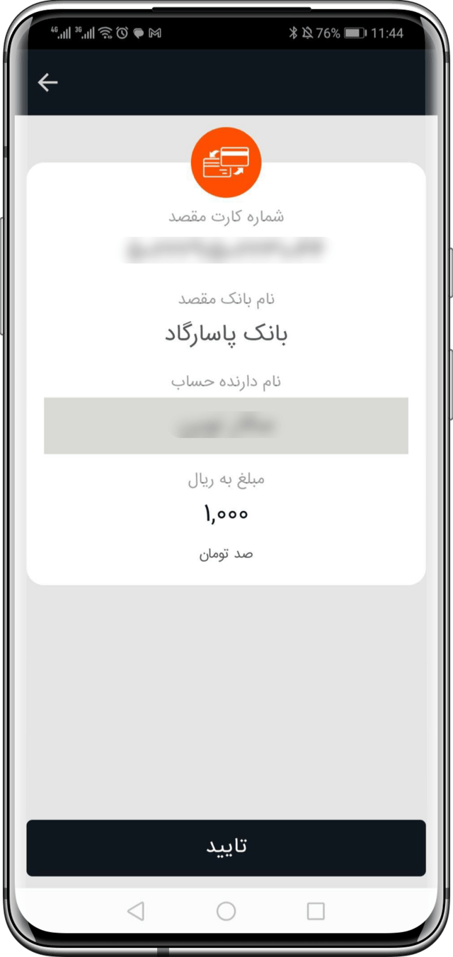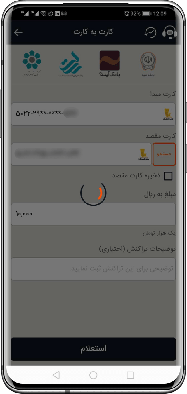 به عنوان مثال در این صفحه مهم ترین بخش یعنی نام دارنده حساب مقصد، مشخص شده است.